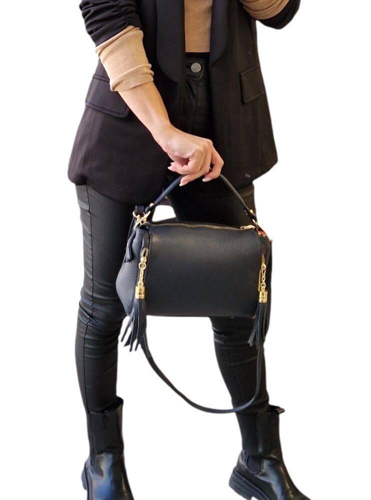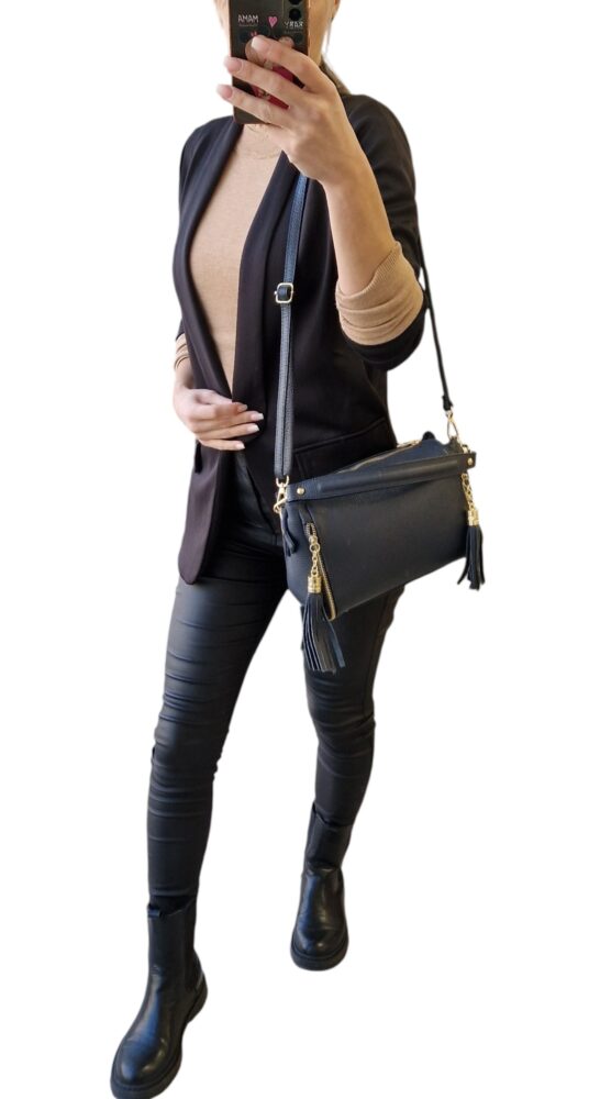 Elegantná dámska kabelka v tmavomodrej farbe. Kabelka má dve odnímateľné ramienka, jedno krátke do ruky ktoré je nenastaviteľné a jedno crossbody nastaviteľné ramienko. Z prednej časti kabelky sú dva ozdobné zipsy so strapcami. Vnútro kabelky obsahuje stredovú prepážku na zips. Moderný dizajn a kvalitné spracovanie.