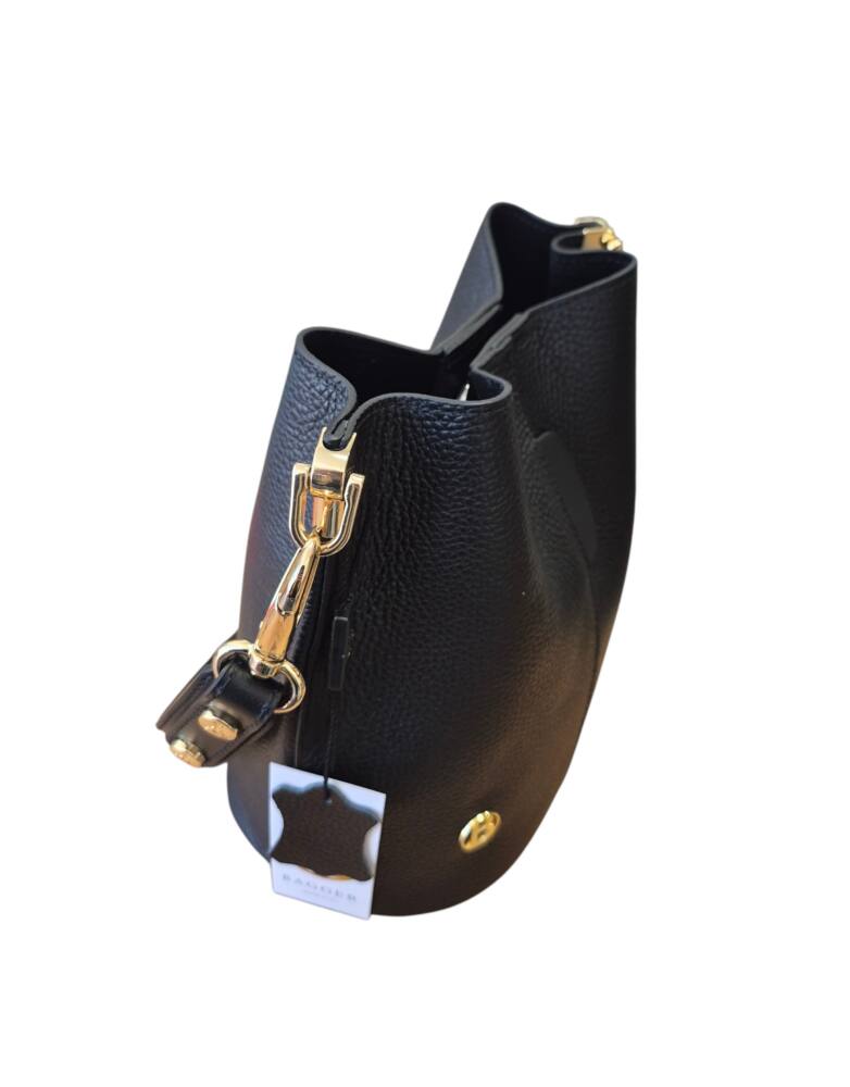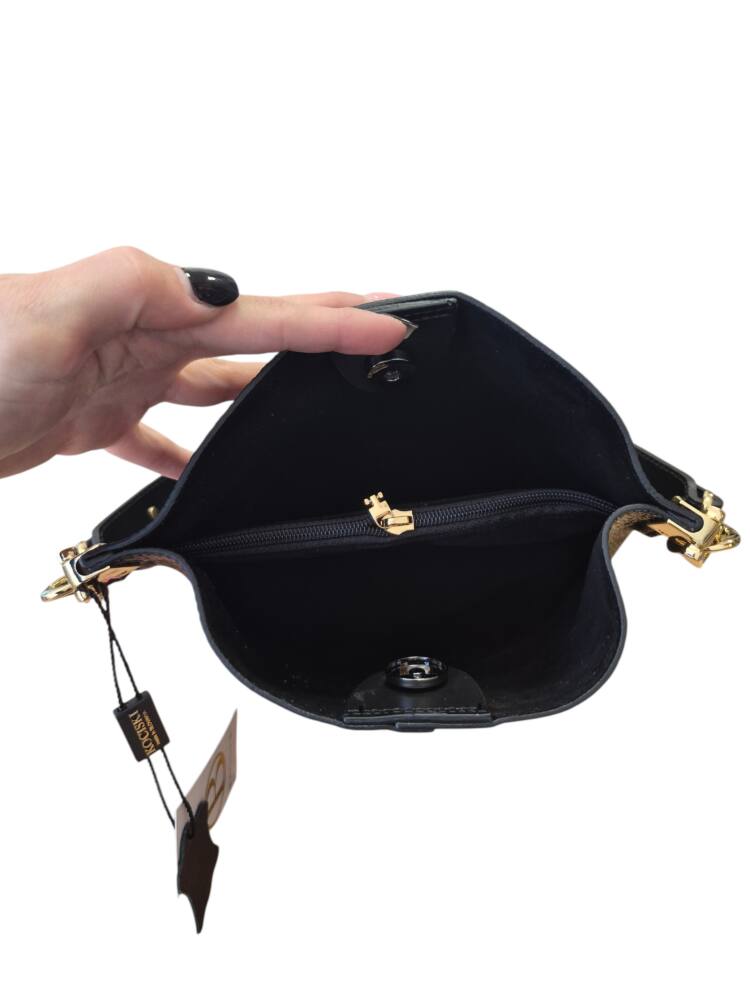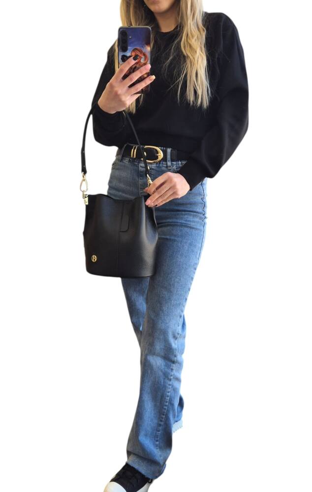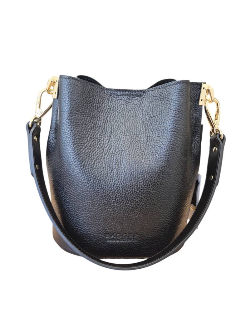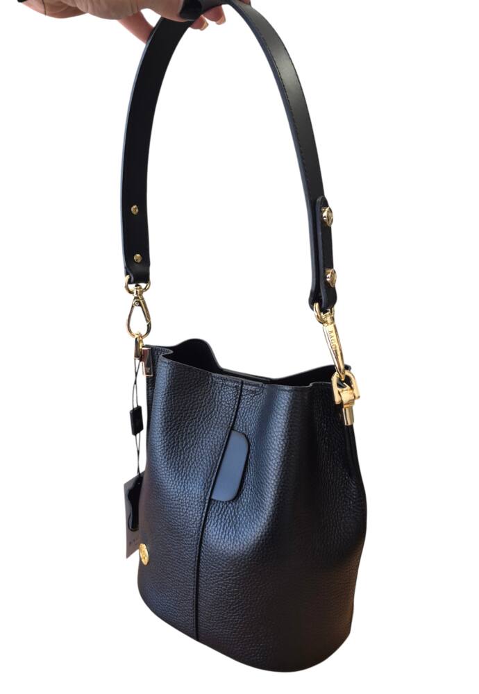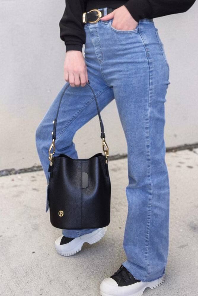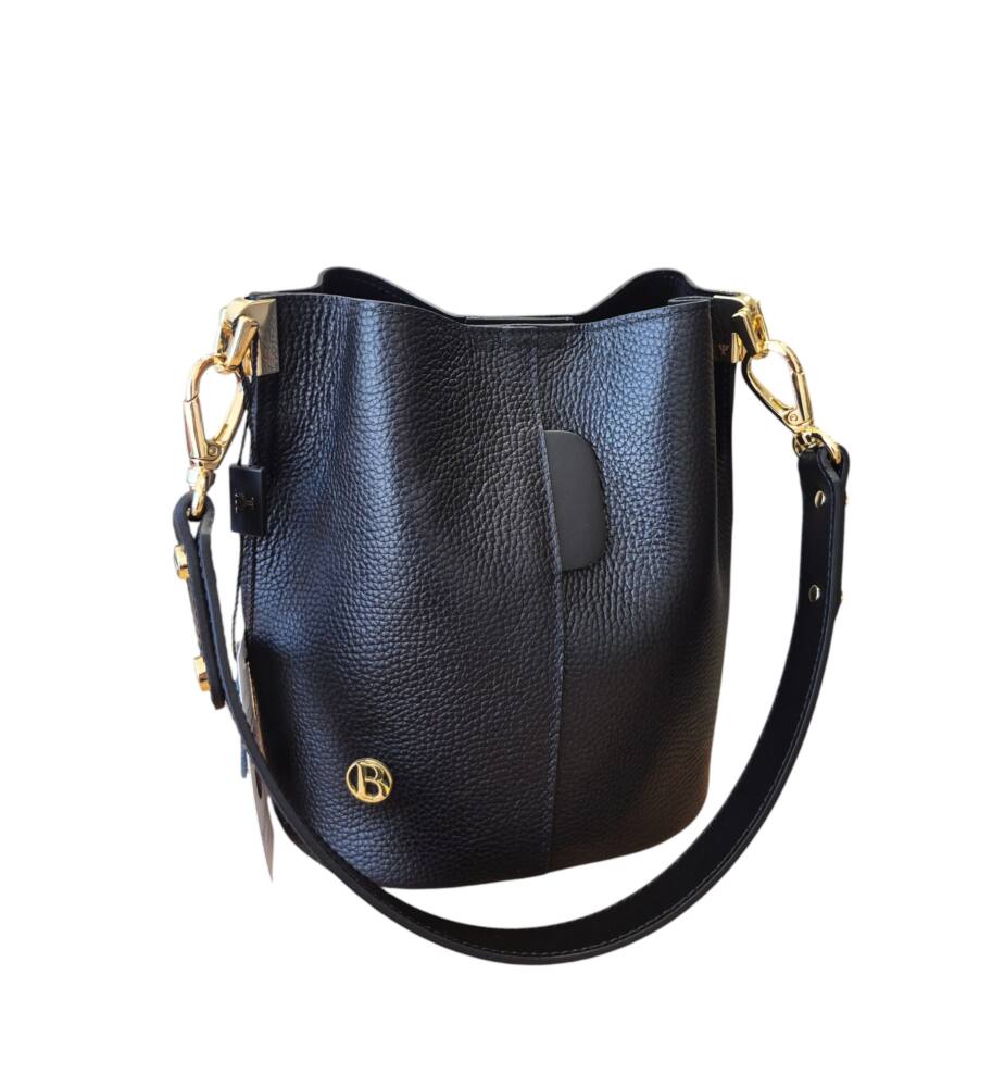 Elegantná čierna vedierková kabelka (Bucket bag) s luxusnými detailmi v zlatej farbe. Hit tejto sezóny s prídavným ramienkom, takže ju môžete nosiť do ruky, na rameno ale aj krížom cez plece ako crossbody. Pevné ramienko pre pohodlné nosenie. 100% pravá koža s jemnou textúrou, odolná voči poškriabaniu. Klasika čierna ktorá sa hodí ku každému outfitu. Menšia veľkosť, dostatok priestoru na všetky drobnosti. Stredová priehradka na zips. Slovenský výrobok – Garancia kvality.