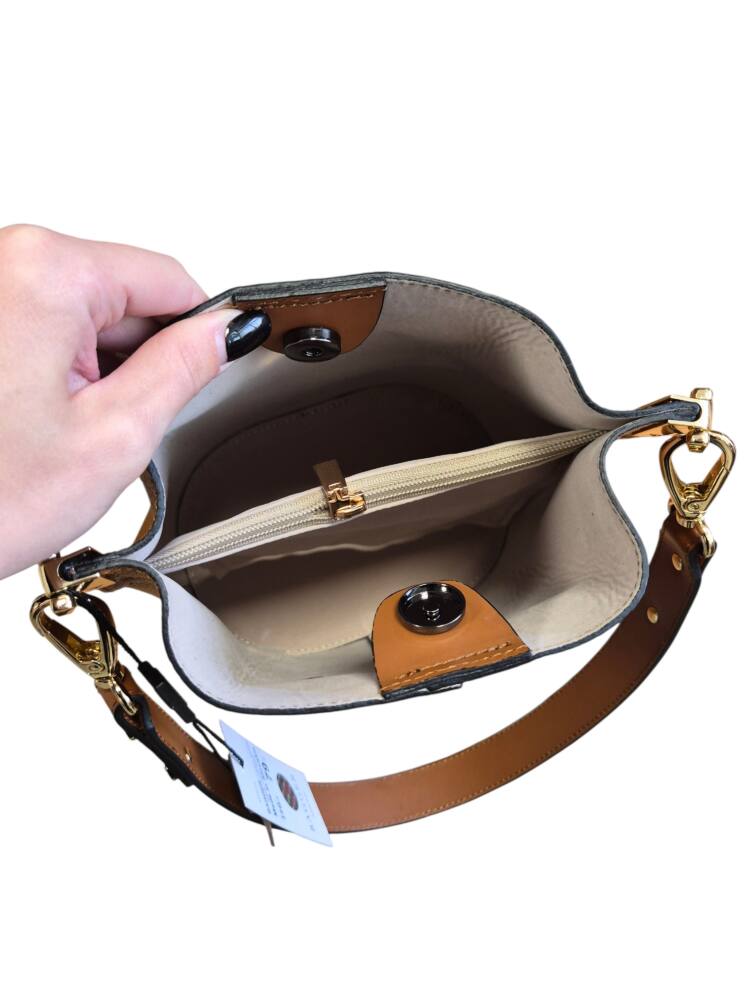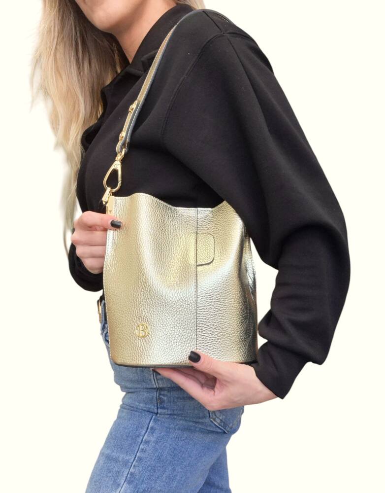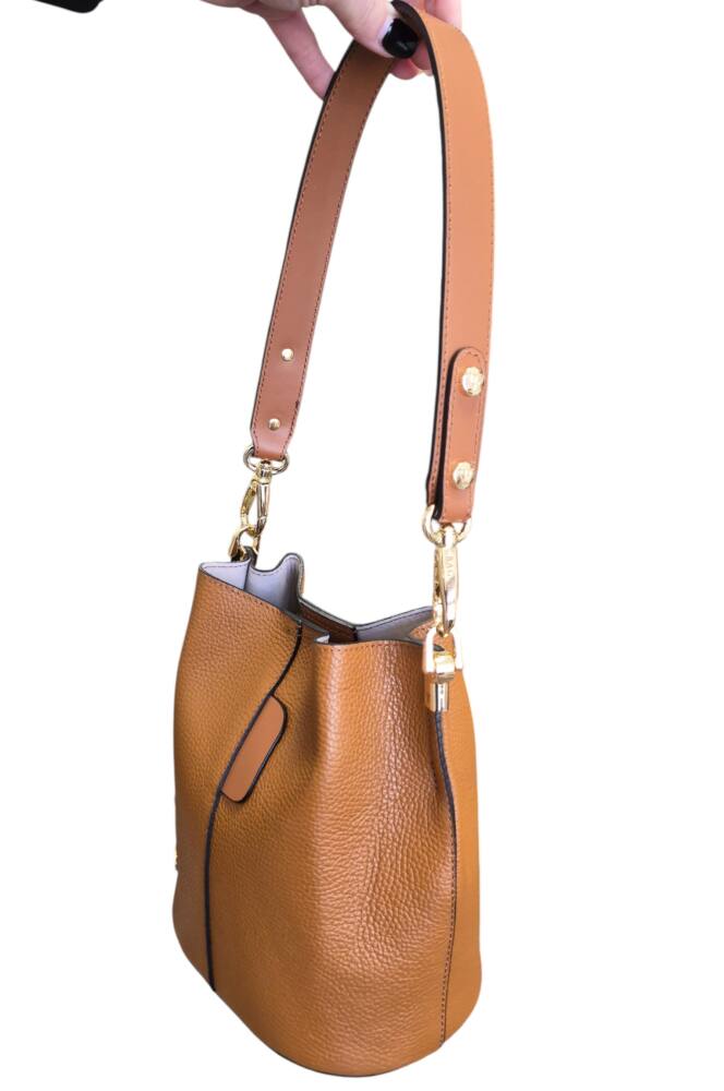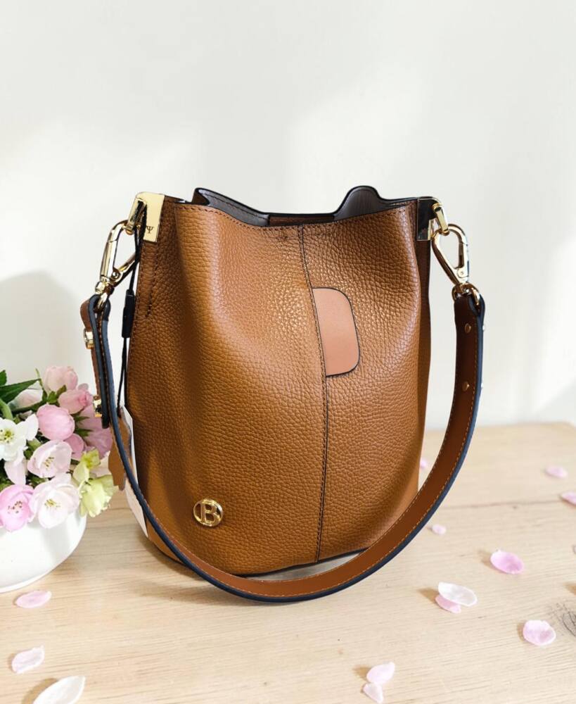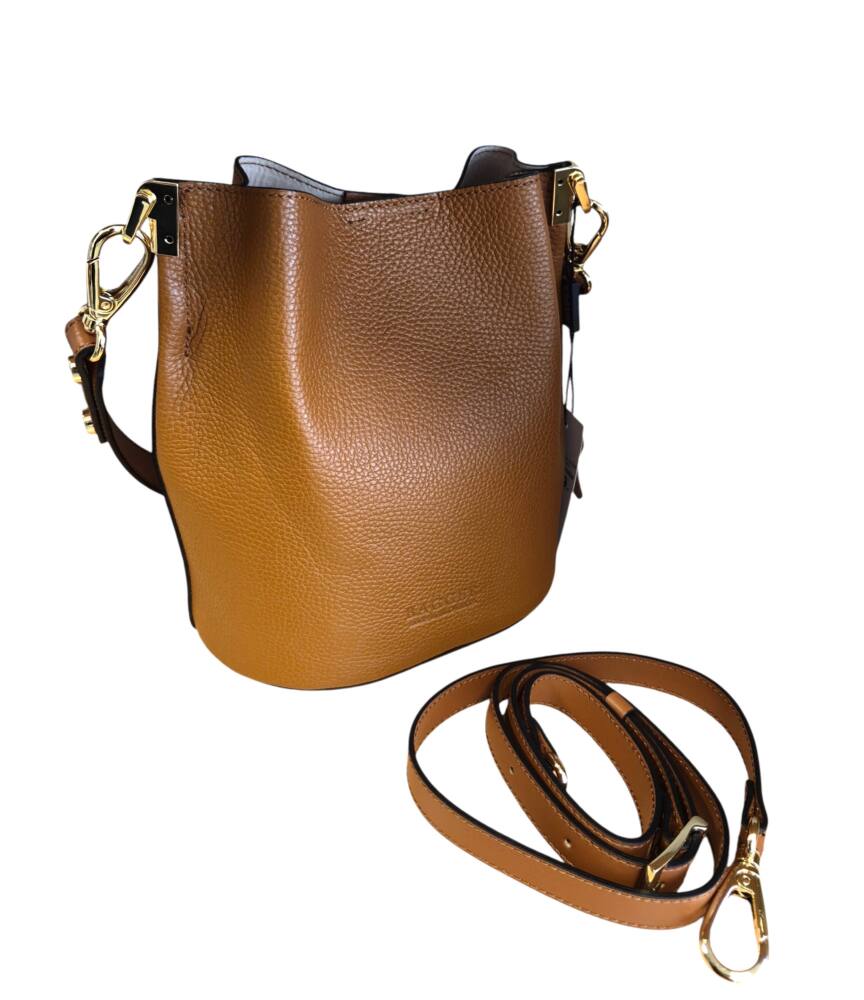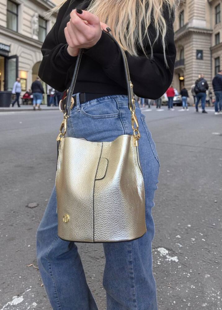 Elegantná hnedá Camel vedierková kabelka (Bucket bag) s luxusnými detailmi v zlatej farbe. Hit tejto sezóny s prídavným ramienkom, takže ju môžete nosiť do ruky, na rameno ale aj krížom cez plece ako crossbody. Pevné ramienko pre pohodlné nosenie. 100% pravá koža s jemnou textúrou, odolná voči poškriabaniu. Štýlová kabelka, ktorá sa hodí ku každému outfitu. Menšia veľkosť, dostatok priestoru na všetky drobnosti. Stredová priehradka na zips. Slovenský výrobok – Garancia kvality.