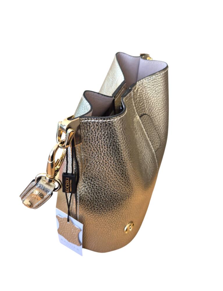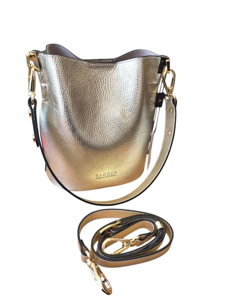 Elegantná zlatá vedierková kabelka (Bucket bag) s luxusnými detailmi v zlatej farbe. Hit tejto sezóny s prídavným ramienkom, takže ju môžete nosiť do ruky, na rameno ale aj krížom cez plece ako crossbody. Pevné ramienko pre pohodlné nosenie. 100% pravá koža s jemnou textúrou, odolná voči poškriabaniu. Štýlová kabelka, ktorá sa hodí ku každému outfitu. Menšia veľkosť, dostatok priestoru na všetky drobnosti. Stredová priehradka na zips. Slovenský výrobok – Garancia kvality.