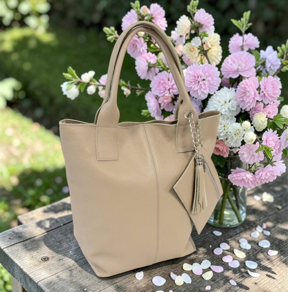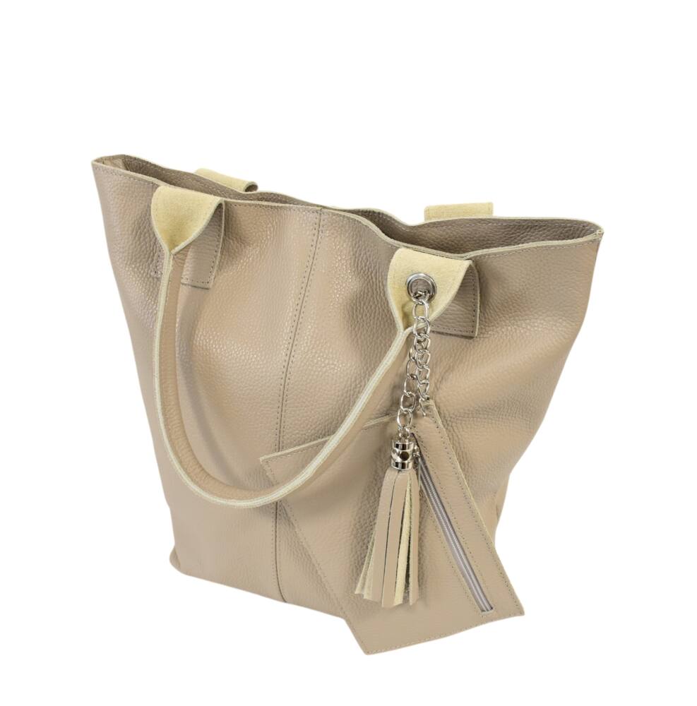 Praktická, športovo elegantná dámska kabelka v bledej béžovej farbe s dvomi ušami do ruky/na rameno. Vhodná na každodenné využitie do práce, na nákupy, či na výlet. Kabelka má formát A4, vhodná aj na spisy a rôzne dokumenty. Súčasťou kabelky je aj prívesok s vrecúškom na drobnosti. Bezpečné zapínanie na zips a vnútorné bočné vrecko tiež na zips. Kvalitné spracovanie a moderný dizajn. Vyrobené v Taliansku.