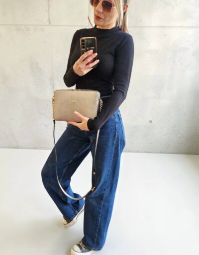 Farba: vrchná časť šedá semišová, zvyšok kabelky je hnedo bielo šedý (károvaný)
